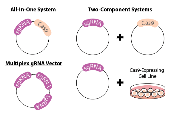 Two-component systems will split expression of the sgRNA and the Cas9 into two separate vectors, or a vector and a Cas9-expressing cell line. The Cas9 vector or cell line can be re-used between experiments, and allows for more flexibility in trying different sgRNAs. However, this can be more expensive and complicated to use than an All-In-One vector.