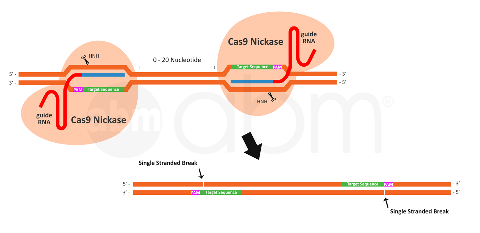 Further considerations need to be taken when using a paired Cas9 nickase to create a double stranded break. When designing sgRNAs for paired nickase activity, it is important to note the following: